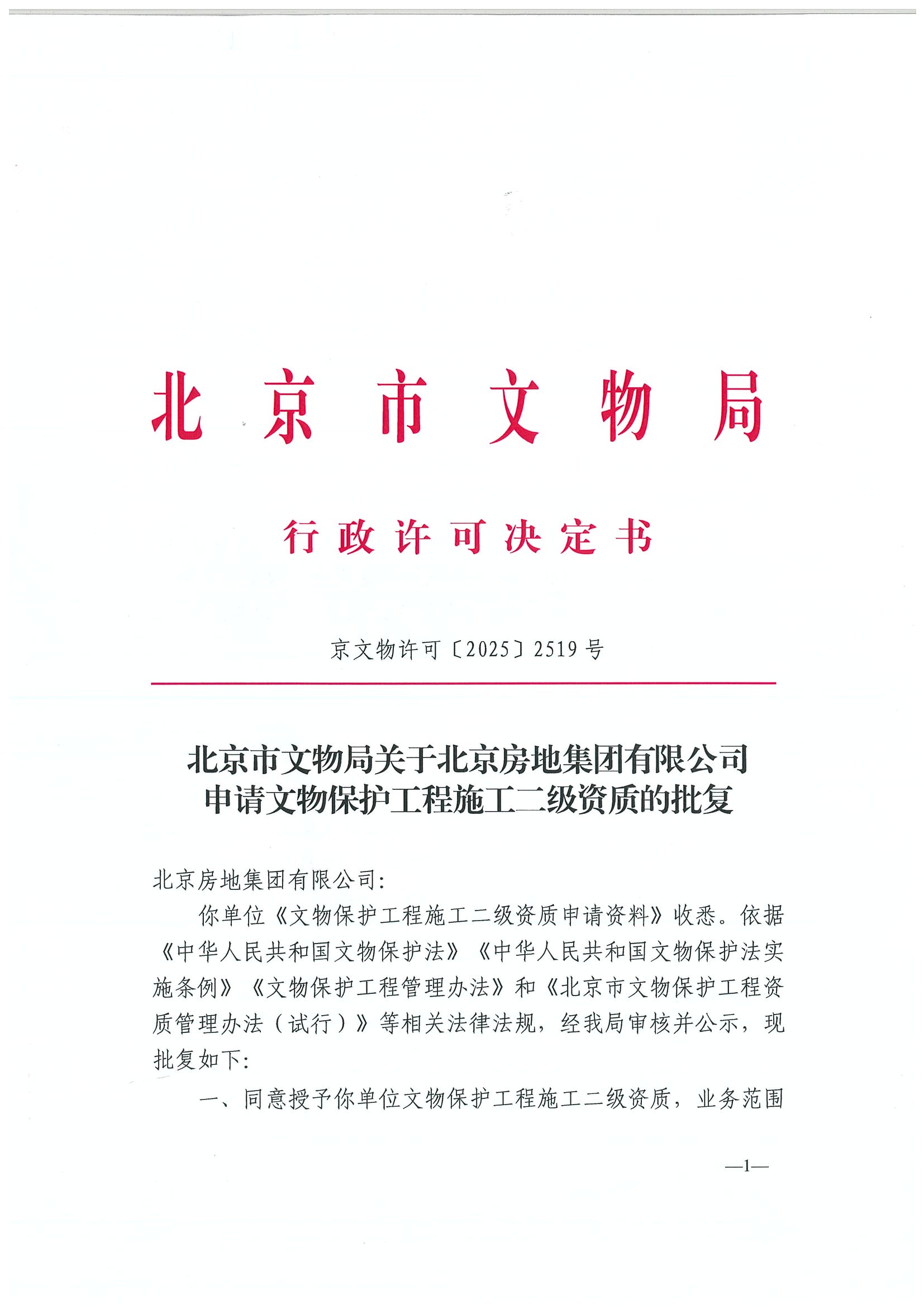近日,北京房地集团有限公司(以下简称“房地集团”)凭借扎实的技术实力、规范的管理体系及丰富的行业经验,成功获得“文物保护工程施工资质二级(古文化遗址古墓葬)”证书。这一里程碑式的成果,标志着房地集团在文物保护领域的专业能力获得权威认可,更凝结着全体员工数年如一日的坚守与付出。